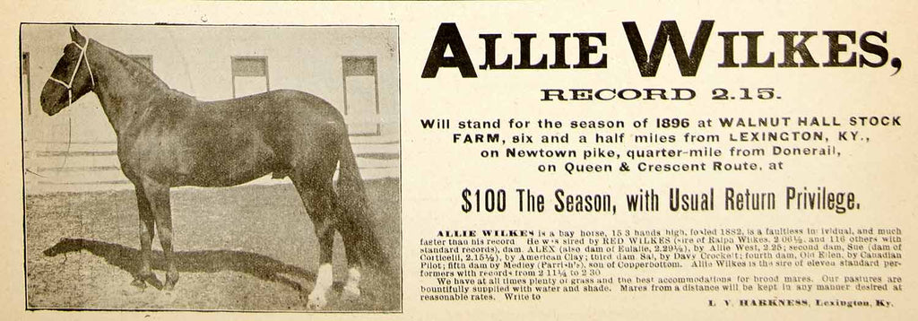 1896 Ad Stud Horse Stallion Allie Wilkes Walnut Hall Stock Farm Kentucky YAHB1