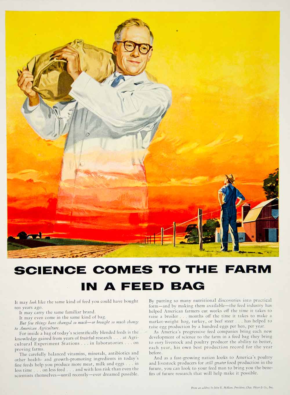 1956 Ad Scientist Giant Farmer Feed John McKeen Address Pfizer Science YFQ1