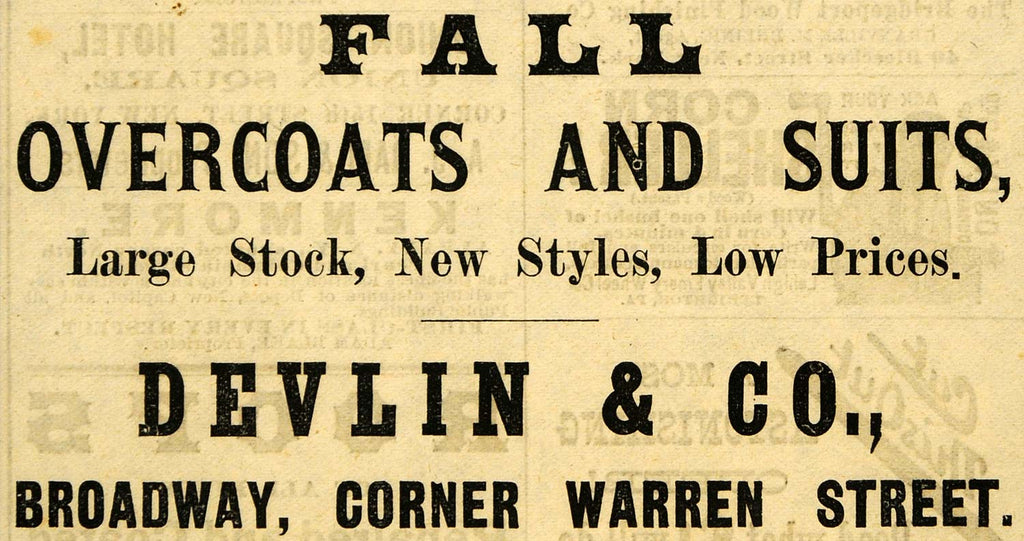 1882 Ad Devlin Fall Fashion Overcoats Suits New York - ORIGINAL ADVERTISING TIN6