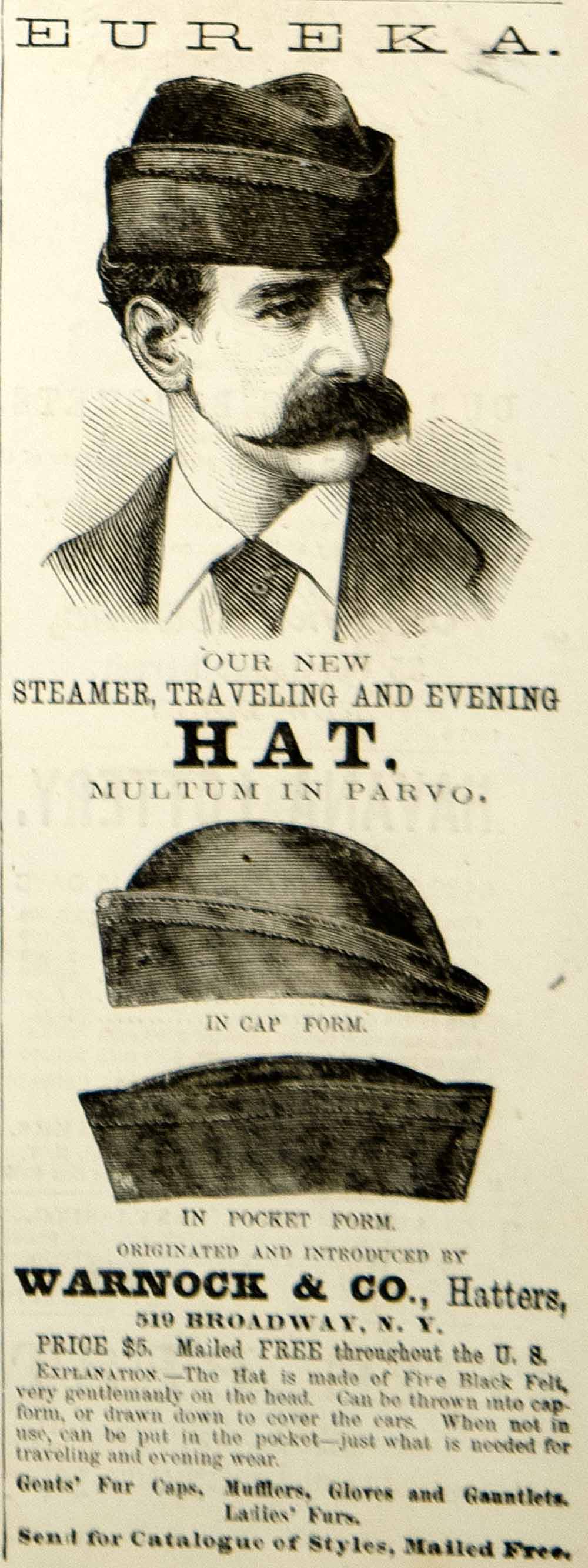 1875 Ad Antique Steamer Traveling Hat Cap Warnock Hatters Victorian Fashion Men