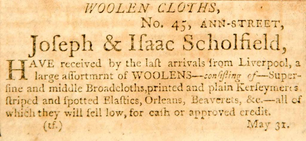 1798 Ad Woolen Cloths Textile Fabric Joseph Isaac Scholfield Boston YJR1