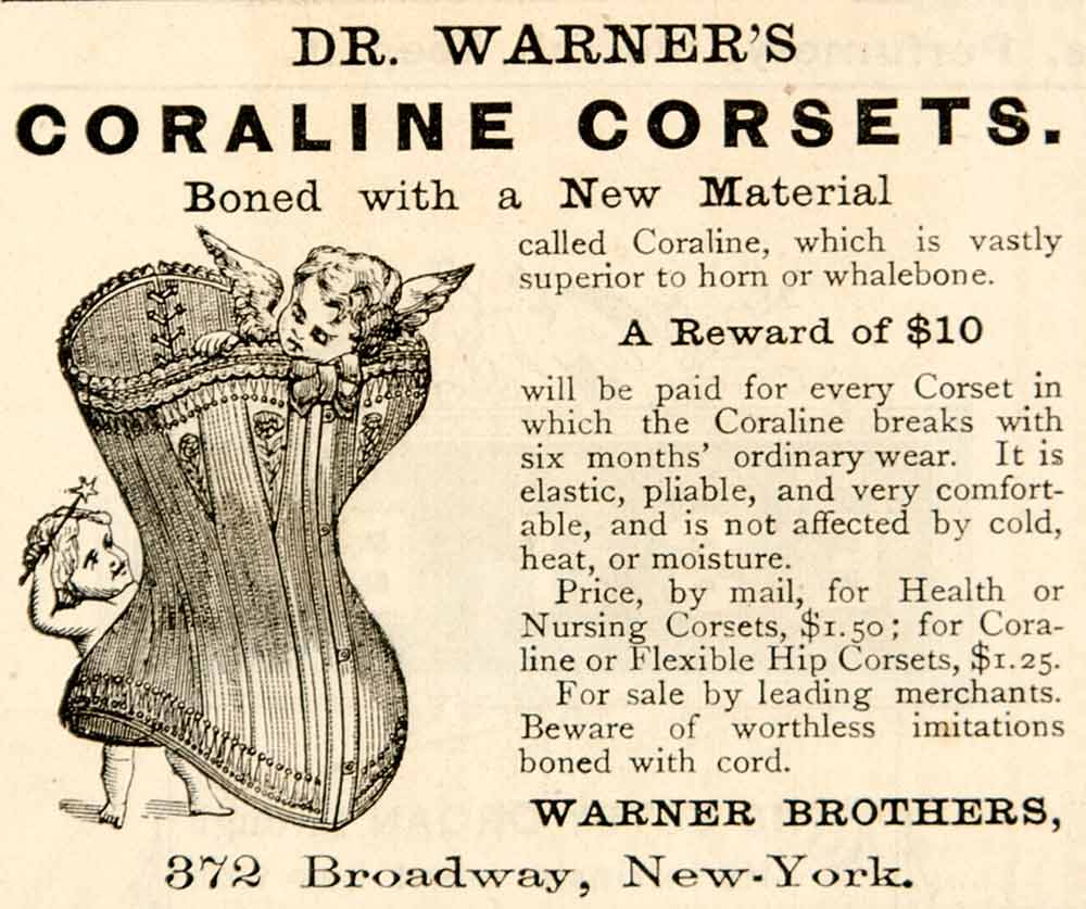 "boned with a new material that is vastly superior to horn or whalebone" from Warner Brothers, 372 Broadway, NYC.