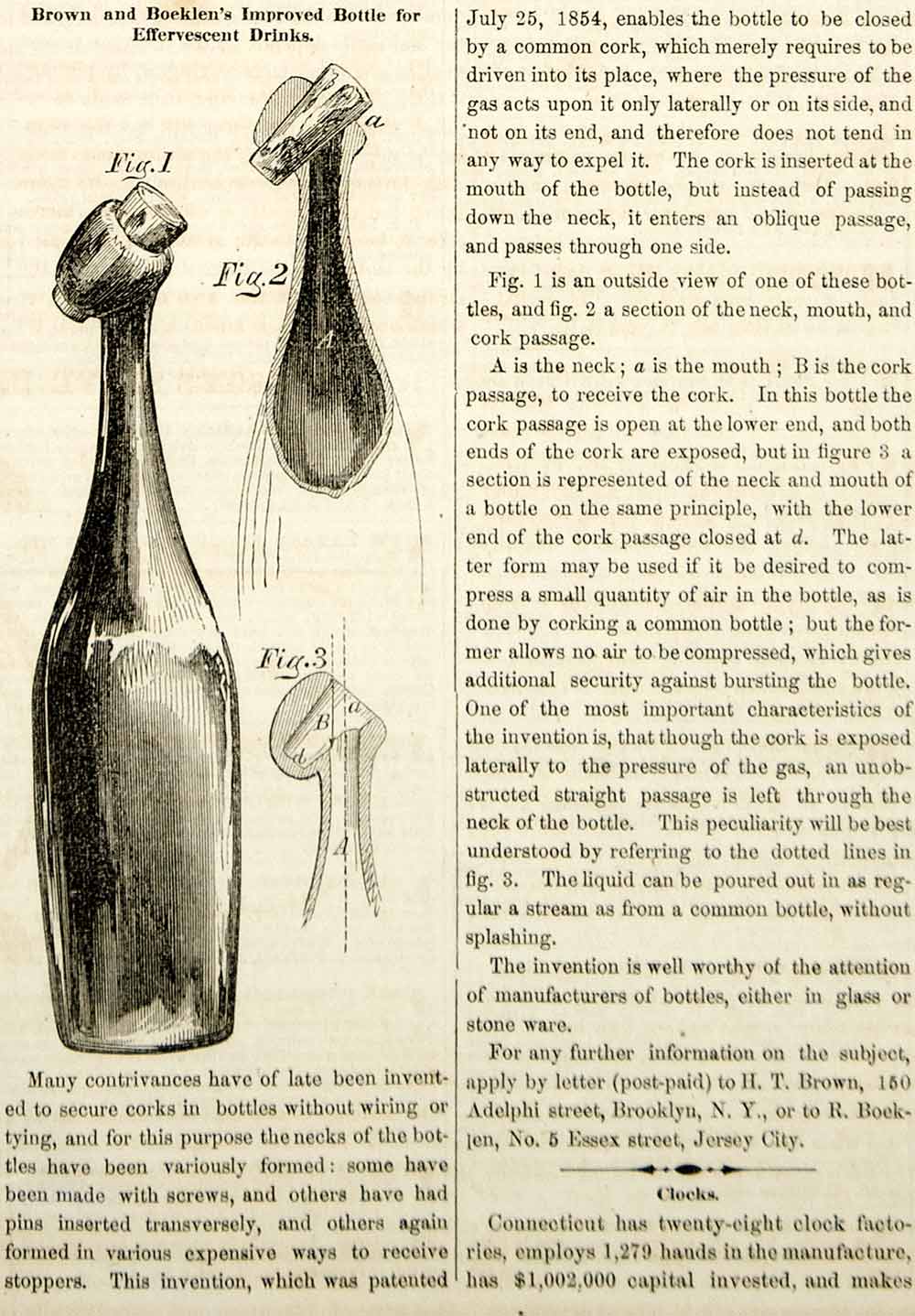 1854 Wood Engraving Brown Boeklen Bottle Cork Effervescent Drink Invention YSA2