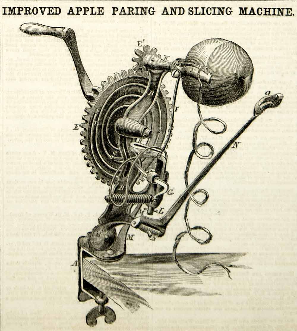 1856 Wood Engraving Apple Paring Slicing Machine Victorian Invention Tool YSA2