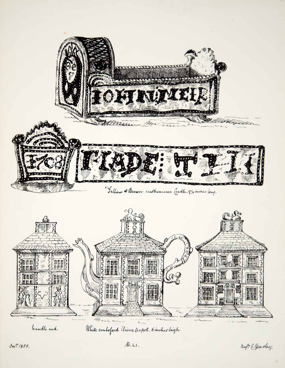 1858 Lithograph Charles Gresley Art Baby Cradle Teapot Staffordshire England ZZ3