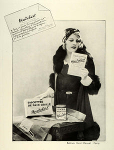This is an original 1931 black and white French print ad for Heudebert's grilled Melba toast foods from Paris, France, as well as their decaffeinated coffee roasts.