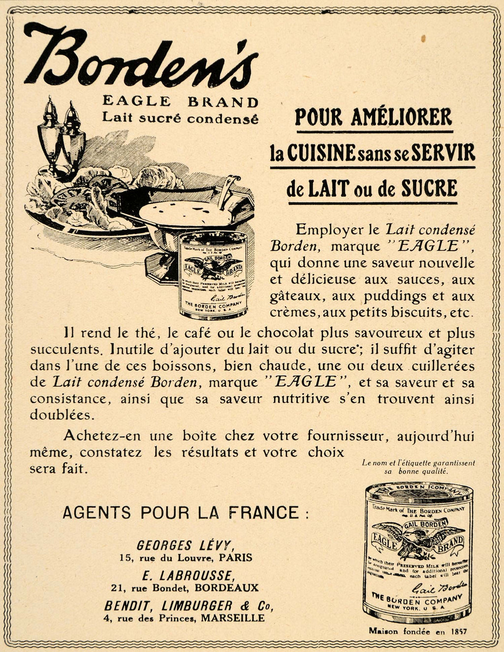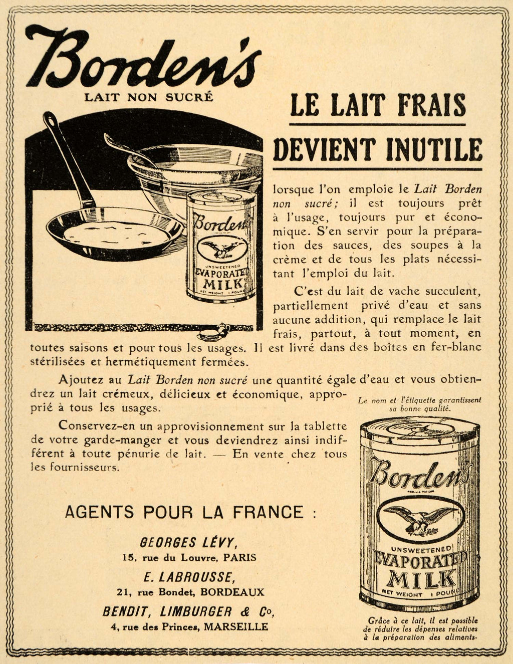 1920 Ad French Bordens Eagle Condensed Milk Lait Canned - ORIGINAL ILL3