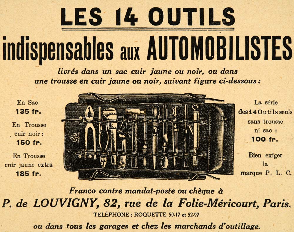 1920 Ad French Car Automobile Tool Set Kit Mechanics - ORIGINAL ADVERTISING ILL3