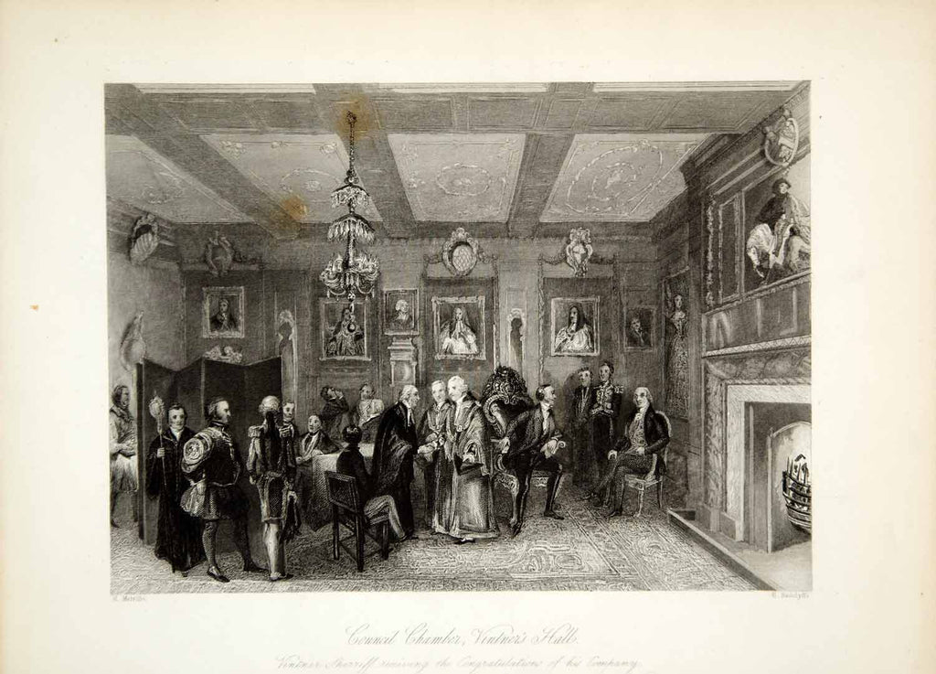 1845 Steel Engraving H Melville Council Chamber Vintners Hall London XGHD9