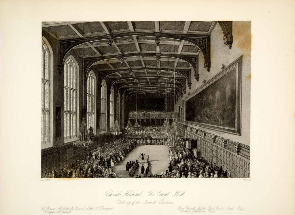 1845 Steel Engraving LL Jewett Christs Hospital Great Hall London UK XGHD9