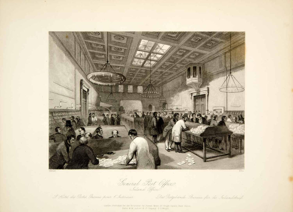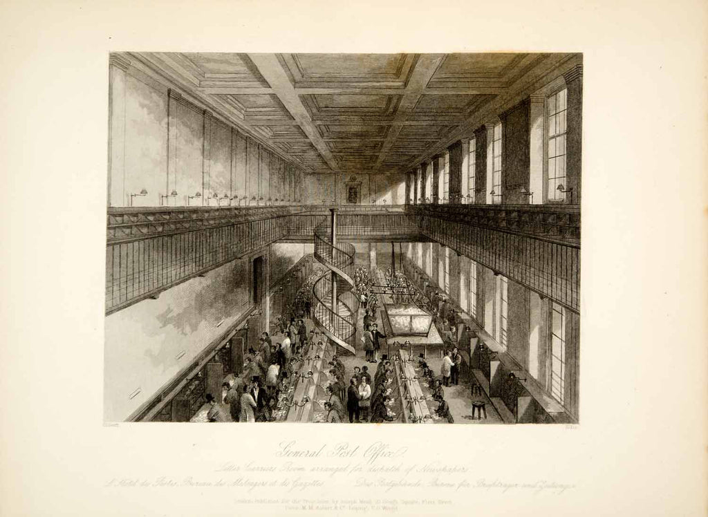 1845 Steel Engraving J Gilbert Post Office Letter Carriers Room London XGHD9