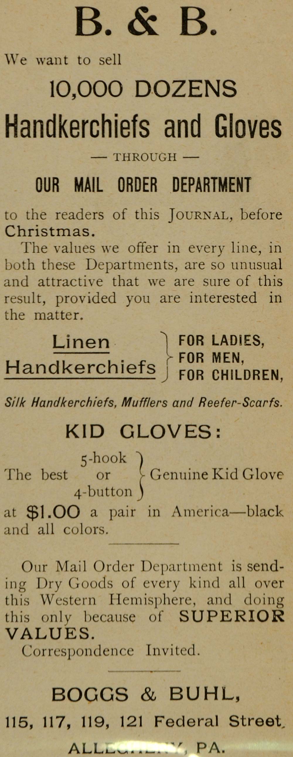 1892 Ad Boggs Buhl Handkerchiefs Gloves Christmas Linen Federal St LHJ4