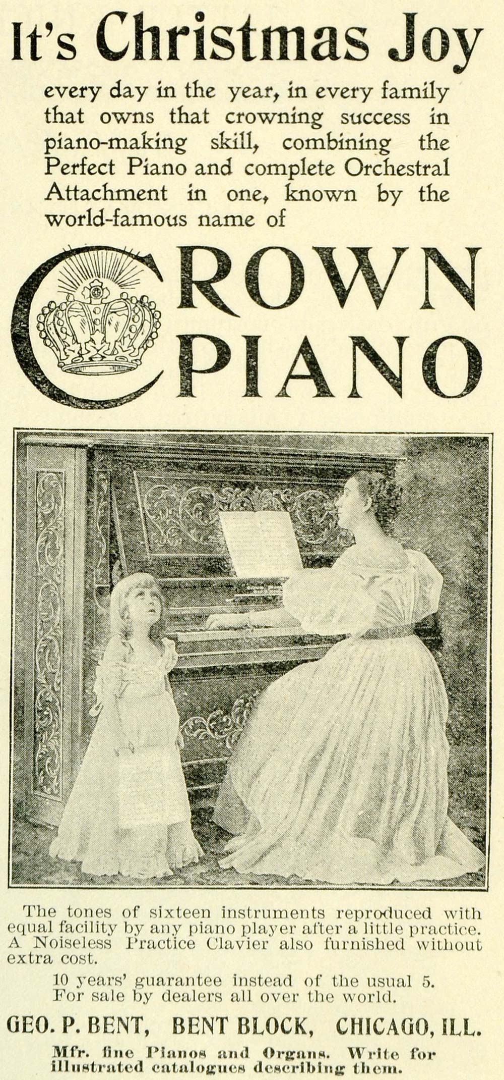 1897 Ad Geo. P. Bent Chicago Crown Pianos Music Mom Girl Duet Sing Holidays LHJ6