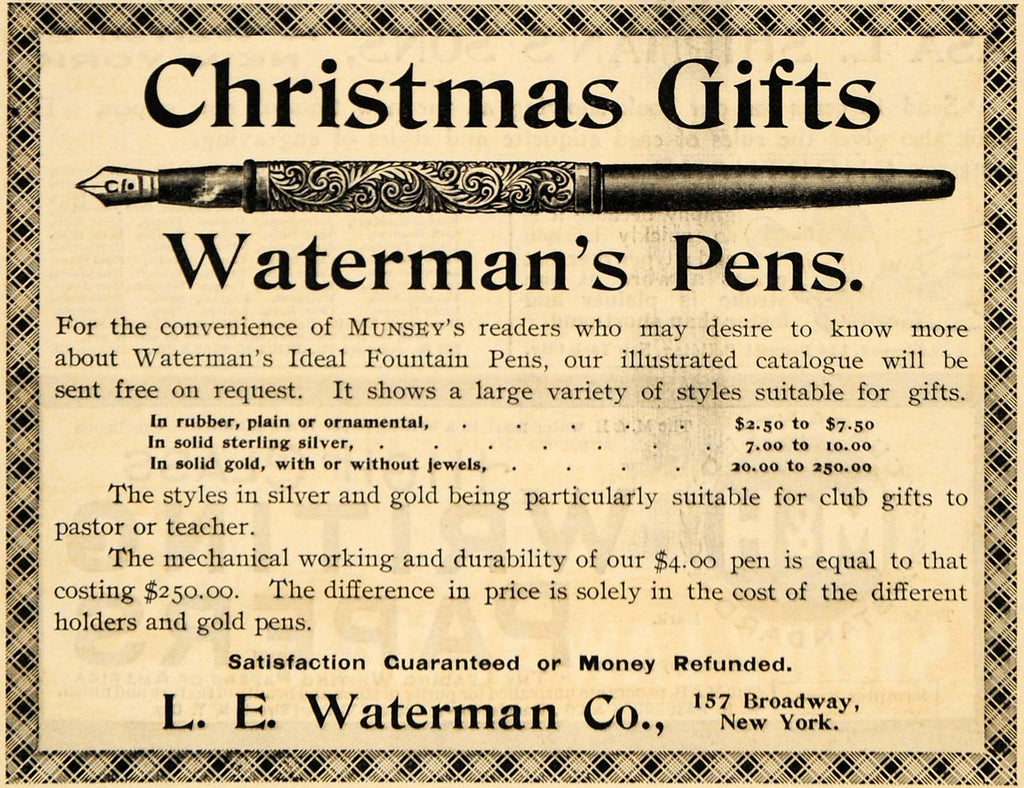 1895 Ad Christmas L E Waterman Fountain Ornamental Pens - ORIGINAL MUN1