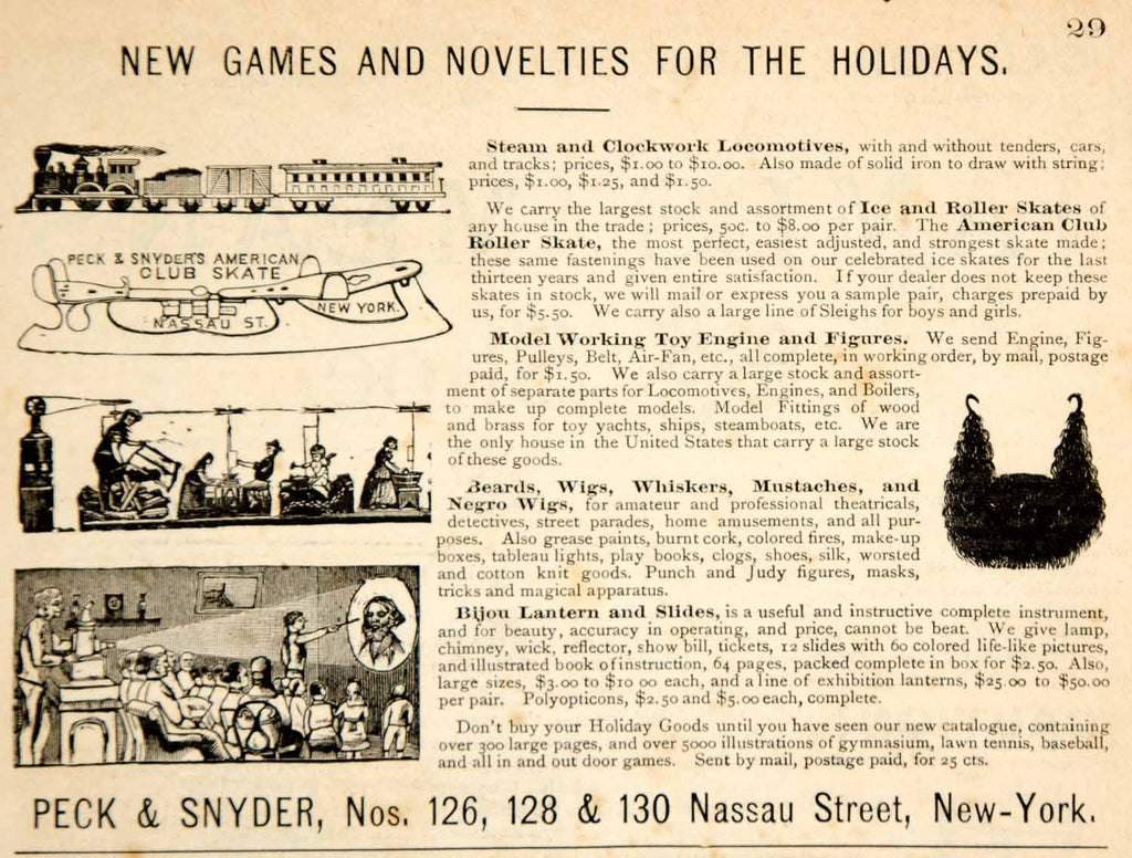 1885 Ad Antique Christmas Toy Gifts Peck & Synder Magic Bijou Lantern Wigs YSN1