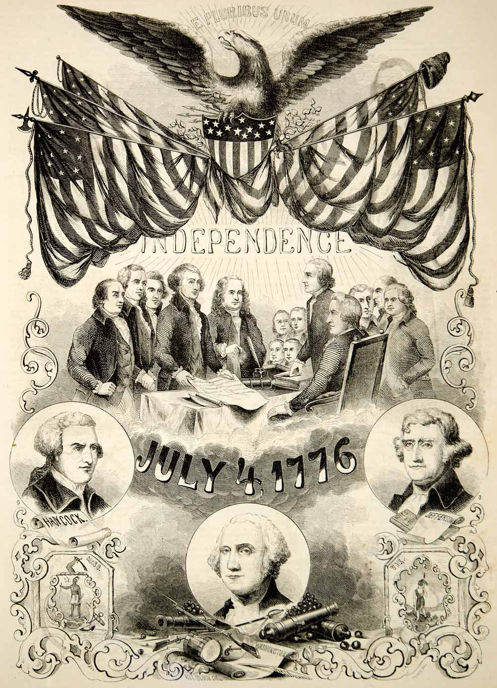 This is an original 1853 black and white in-text wood engraving with portraits of the major players during the American War of Independence: George Washington, John Hancock, and Thomas Jefferson.