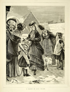 This is an original 1870 black and white in-text wood engraving of a work by Edwin Buckman of Victorian women delivering Christmas baskets to the poor.CONDITION