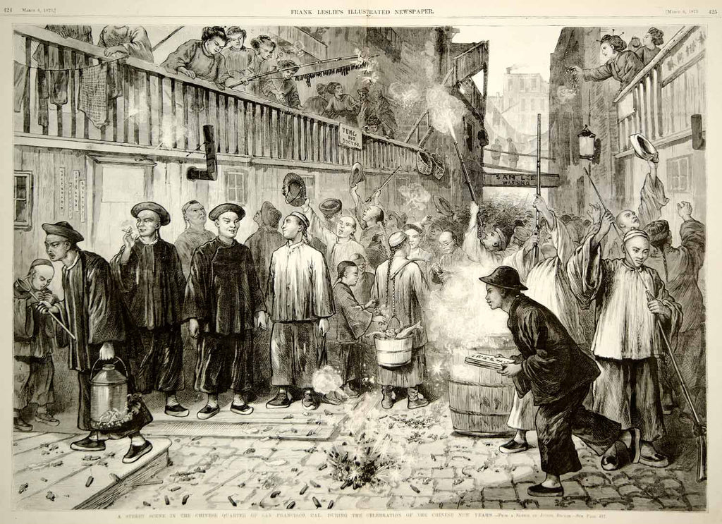 1875 Wood Engraving Chinatown San Francisco New Year's Celebration Firecrackers