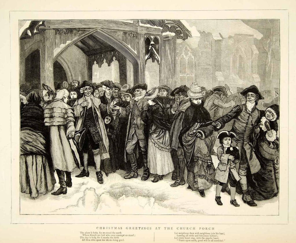 1874 Wood Engraving Art Christmas Greetings Church Porch Holiday Christian YTGA1