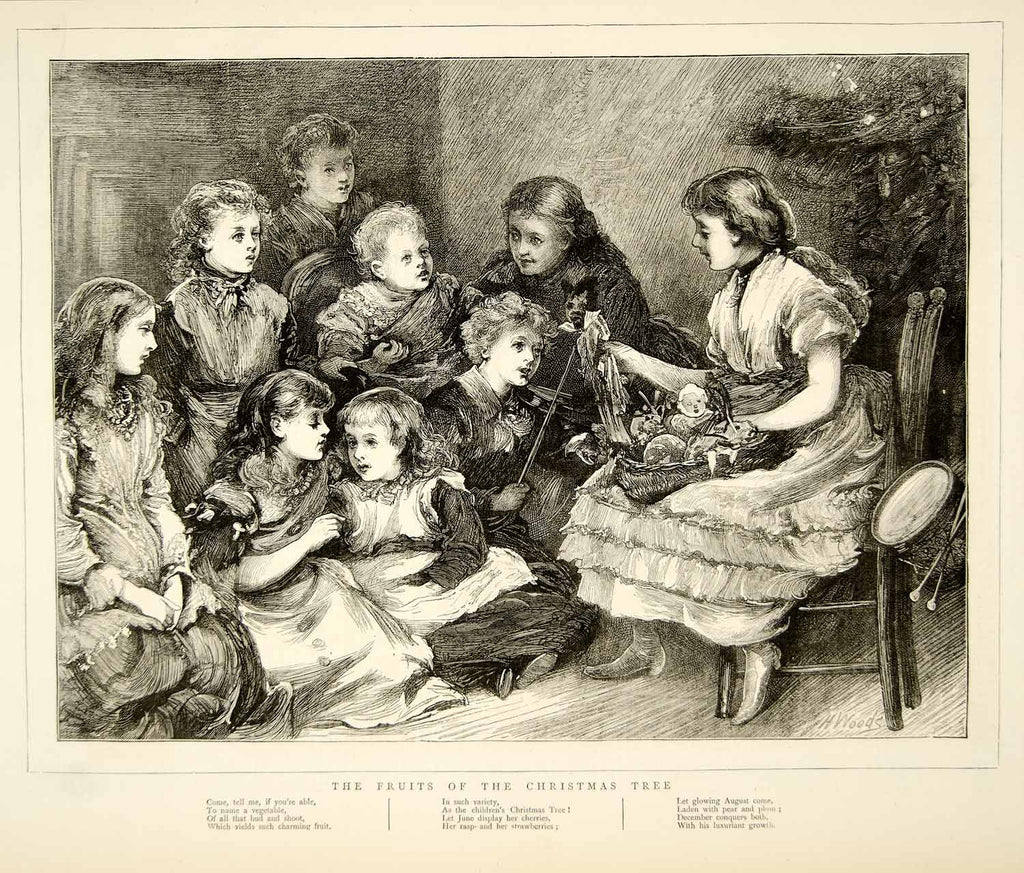 1874 Wood Engraving Henry Woods Art Fruits Christmas Tree Children Holiday YTGA1