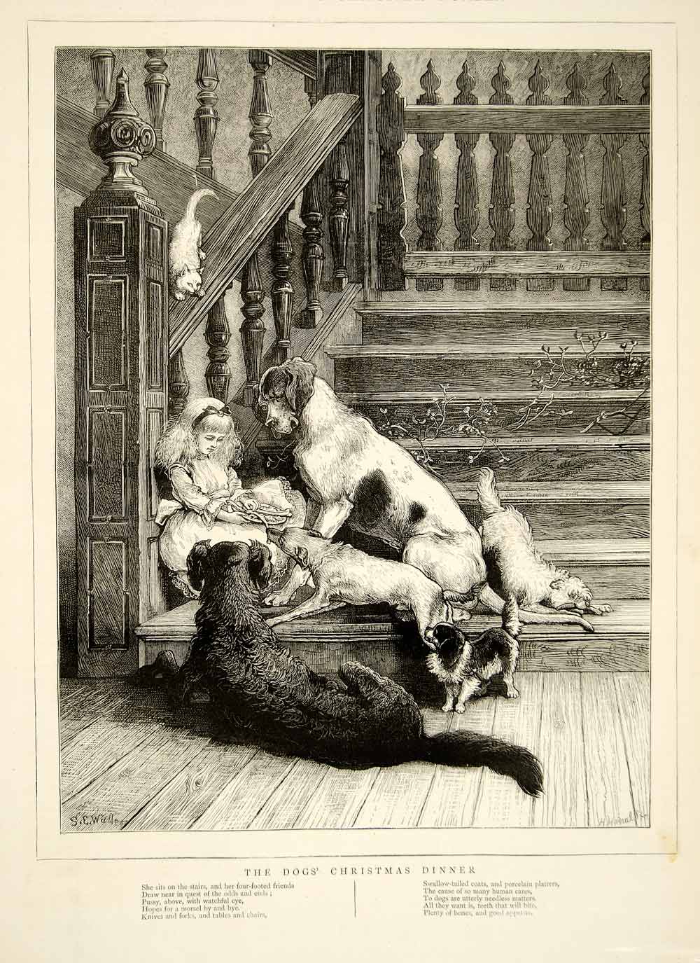 1874 Wood Engraving Samuel E Waller Art Dogs Christmas Dinner Holiday Pets YTGA1