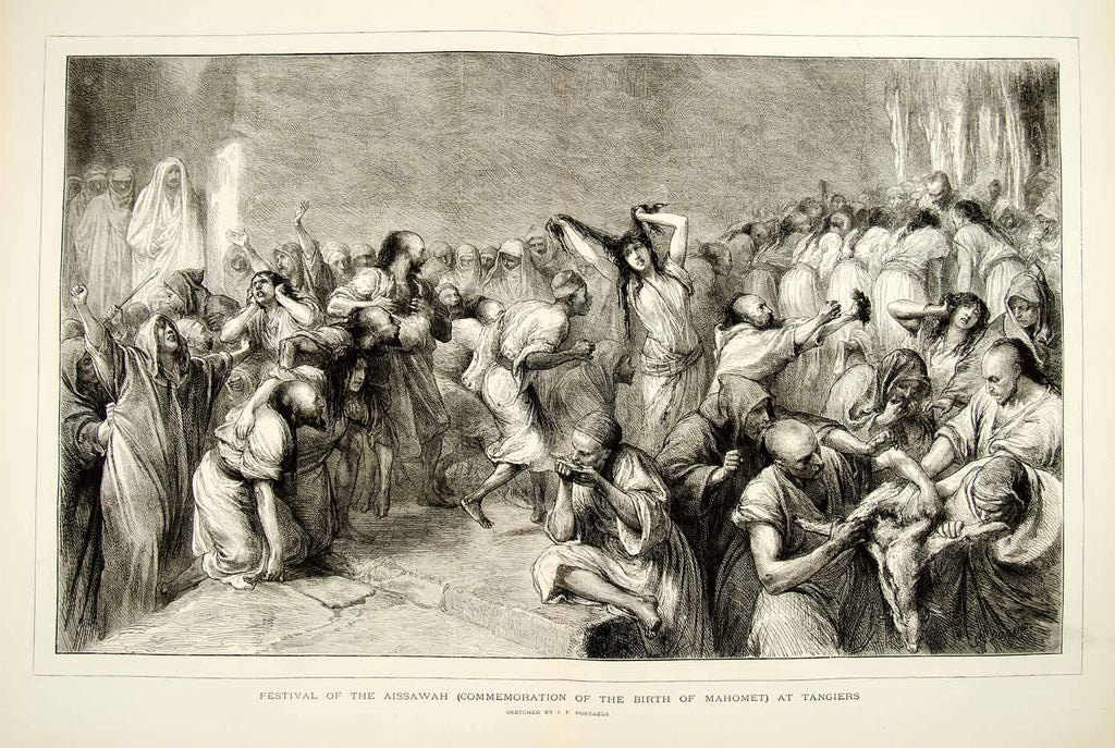 1874 Wood Engraving Jean-Francois Portaels Art Aissawa Mawlid Islam Muslim YTGA1