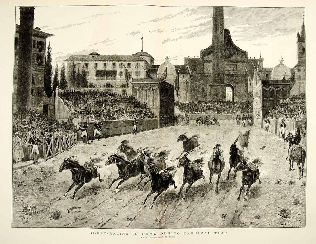 1874 Wood Engraving Guiliano Zasso Art Horse Racing Rome Italy Equestrian YTGA1