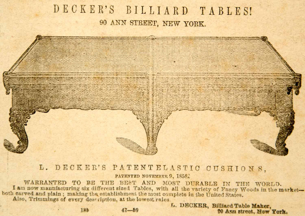 1860 Ad Antique Decker's Billiard Pool Table 90 Ann Street New York City NYN1