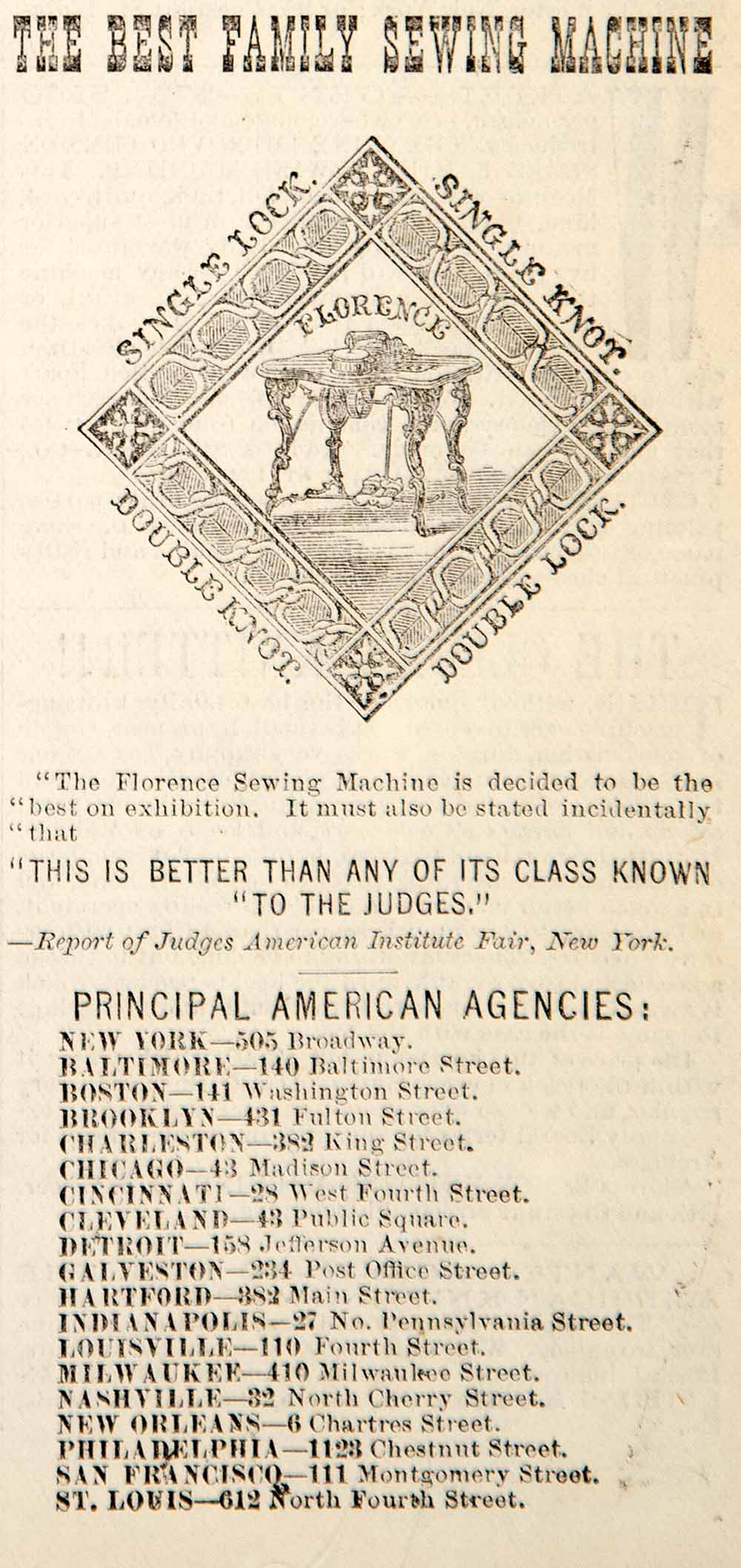 1870 Ad Antique Florence Sewing Machine Agencies Victorian Clothing Vintage YPM3