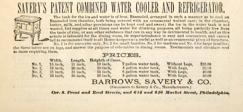1870 Ad Antique Barrows Savery Water Cooler Refrigerator Kitchen Appliance YPM3