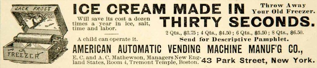 1891 Ad Ice Cream Vending Machine Jack Frost Freezer Victorian 43 Park St YYC1