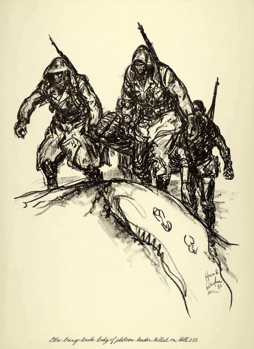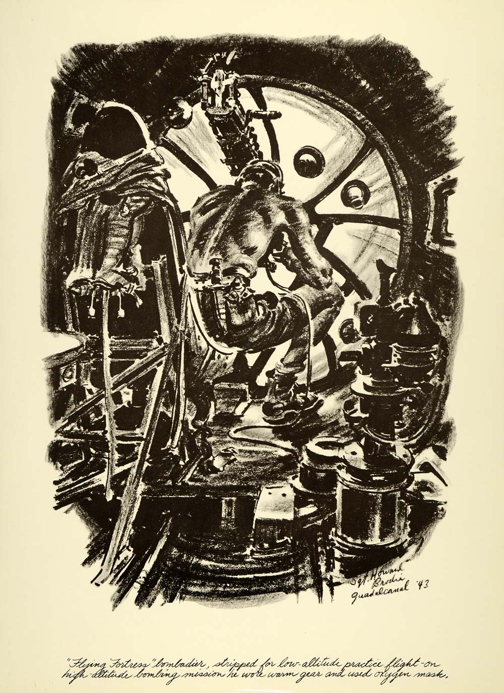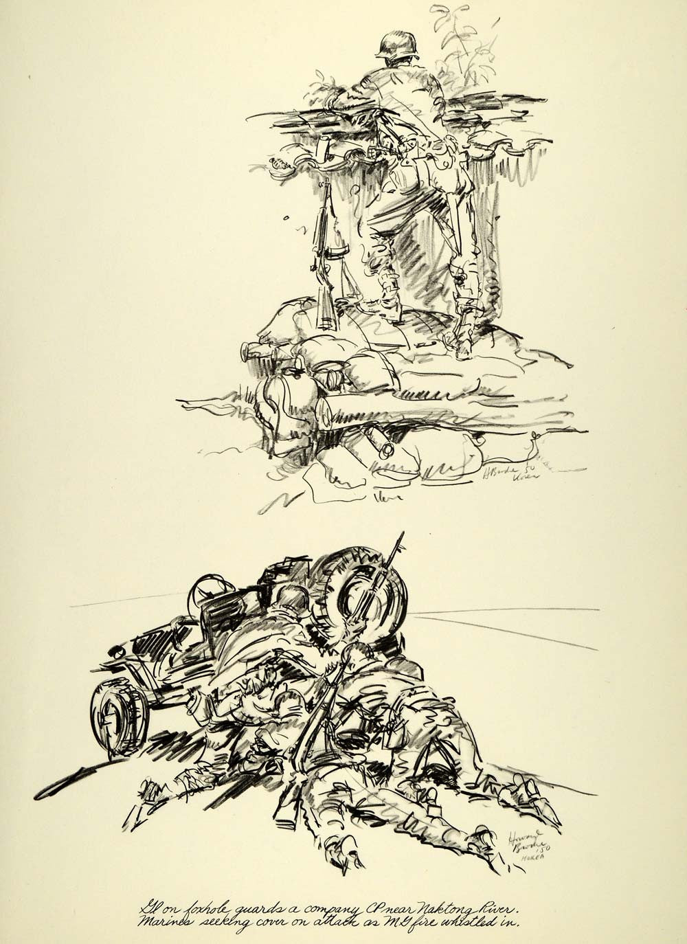 Howard Brodie (1915-2010) was a renowned artist known for his combat sketches and courtroom scenes. Brodie enlisted in the Army in 1942, and recorded the end of the Guadalcanal campaign, as well as the Central Europe and Rhineland campaigns. Brodie’s prints were featured in Yank, the Army Weekly magazine, which made him a popular wartime sketch artist. He never carried a weapon during the war, but found himself under fire on various occasions, where he dropped his sketchpad and worked as a medic; for this, he was awarded the Bronze Star of Valor.