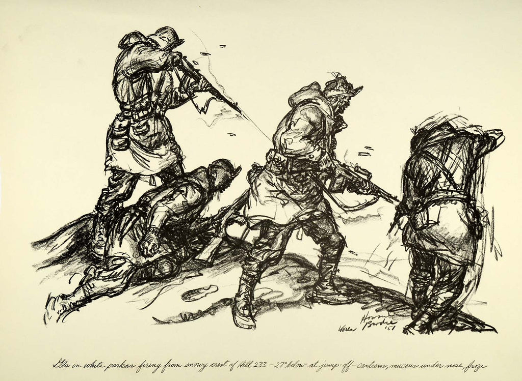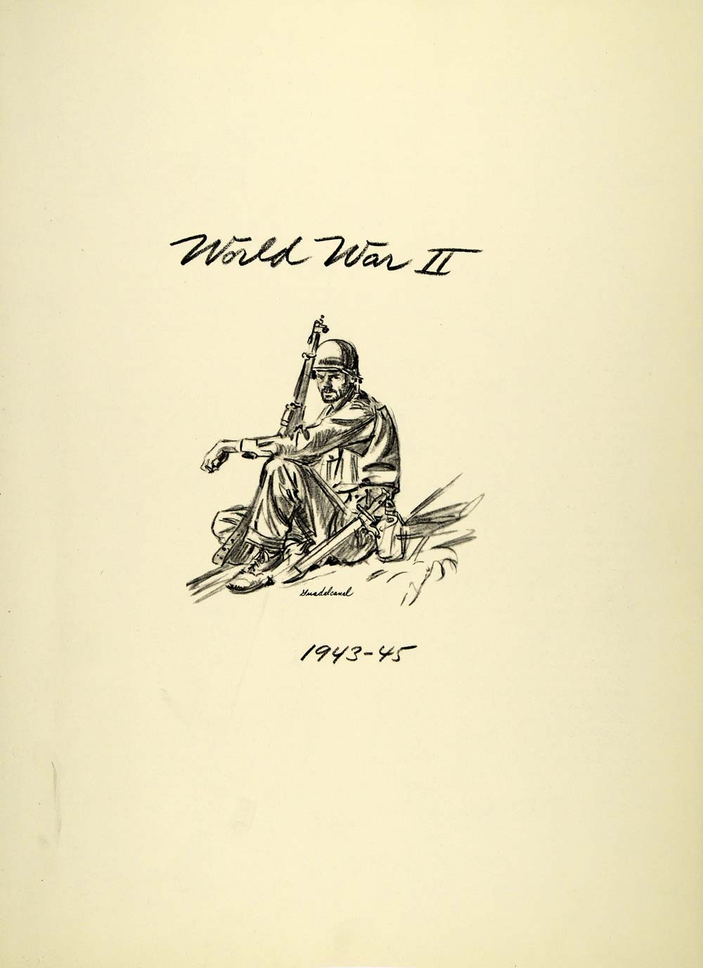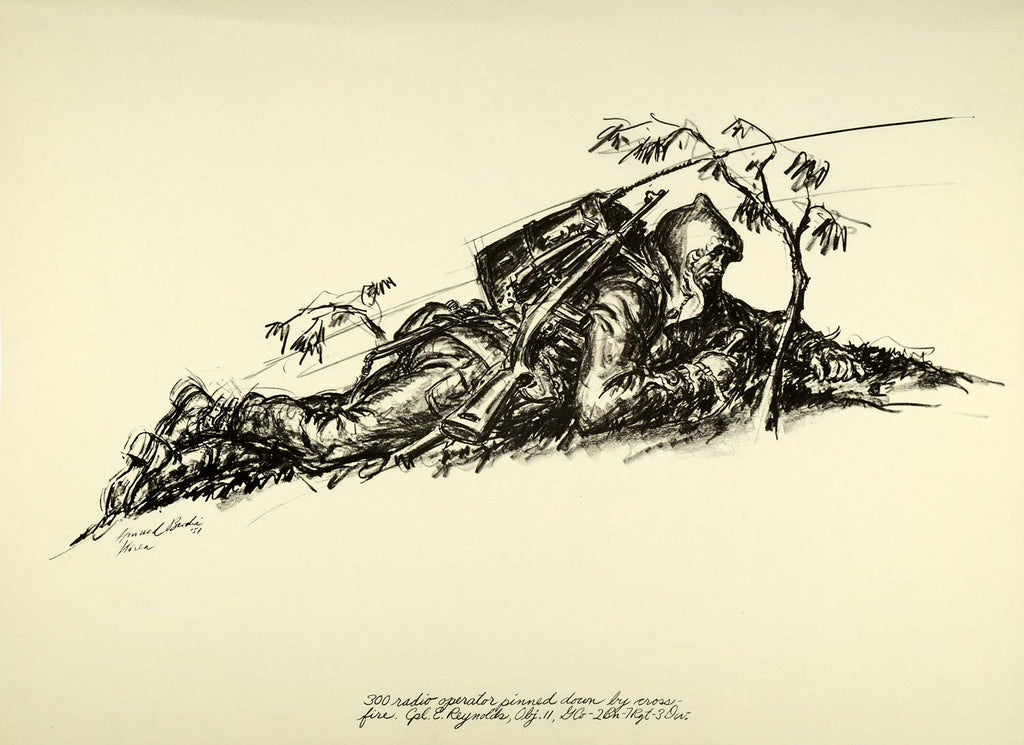 Howard Brodie (1915-2010) was a renowned artist known for his combat sketches and courtroom scenes. Brodie enlisted in the Army in 1942, and recorded the end of the Guadalcanal campaign, as well as the Central Europe and Rhineland campaigns. Brodie’s prints were featured in Yank, the Army Weekly magazine, which made him a popular wartime sketch artist. He never carried a weapon during the war, but found himself under fire on various occasions, where he dropped his sketchpad and worked as a medic; for this, he was awarded the Bronze Star of Valor.