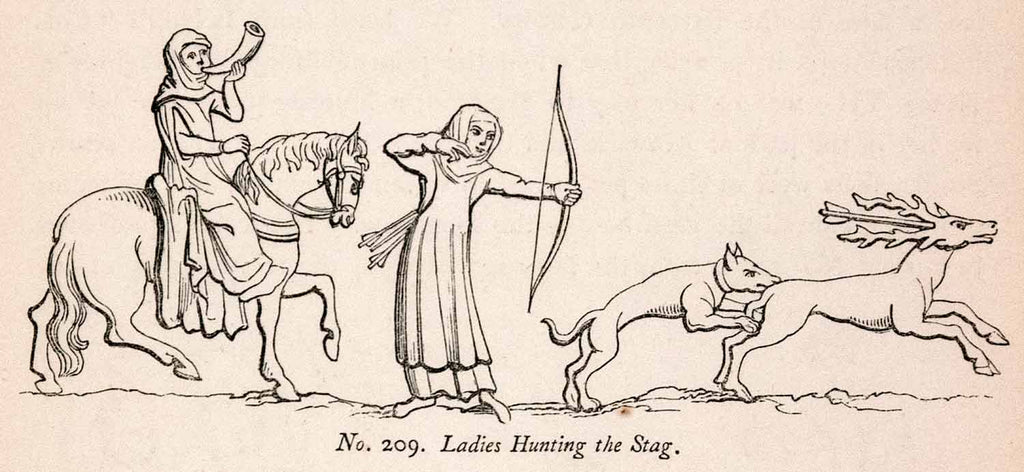 1862 Wood Engraving Frederick William Fairholt Ladies Hunting Stag Deer XGBA4