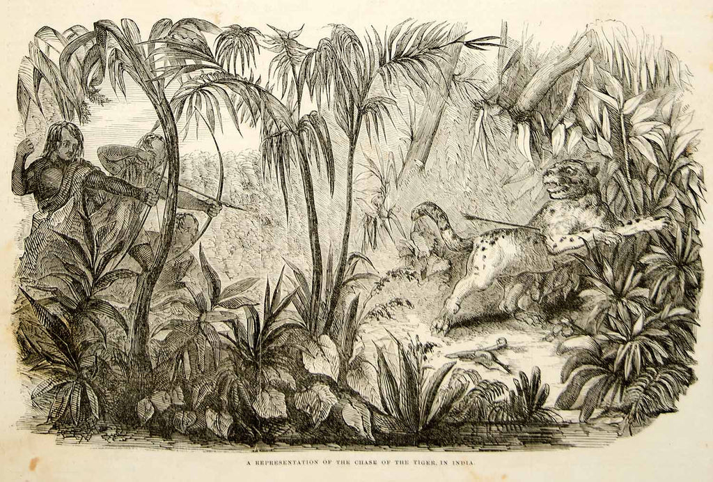 1852 Wood Engraving Art Bengal Tiger Hunting India Asia Sportsman Animals YGP1