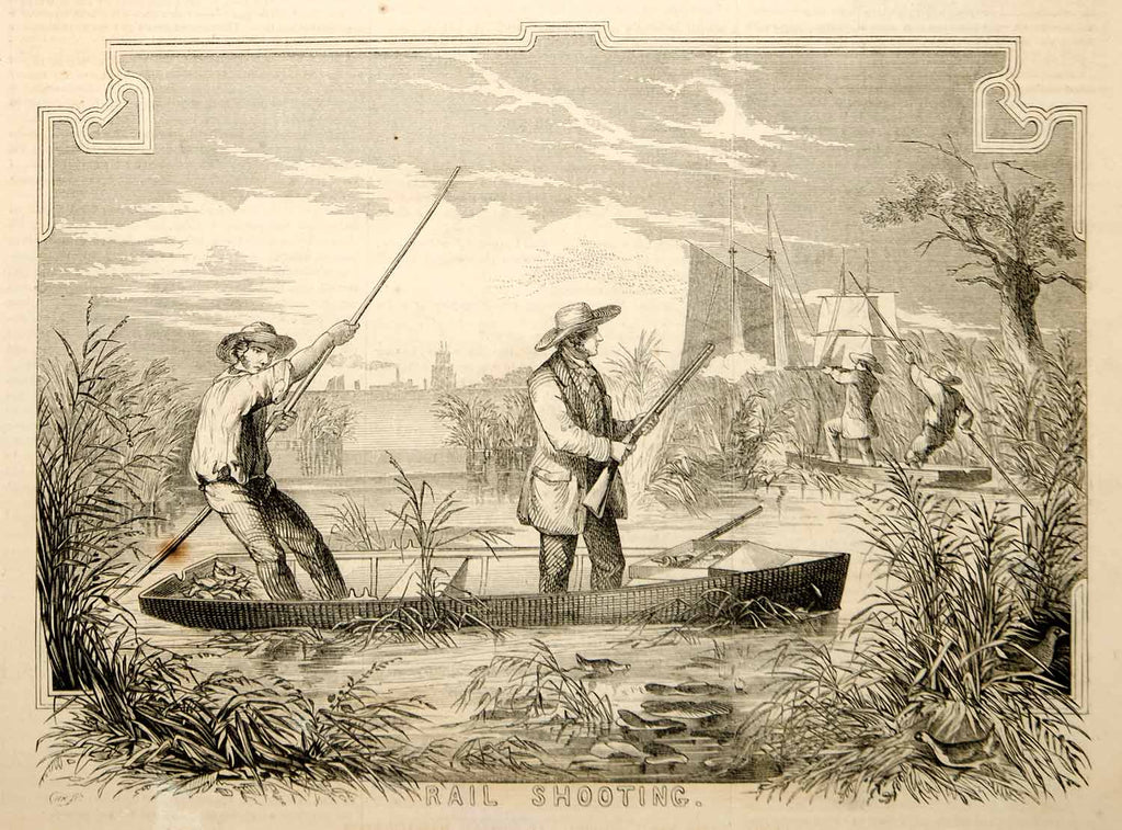 1853 Wood Engraving Rail Birds Shooting Rallidae Marshland Boats Hunters Guns