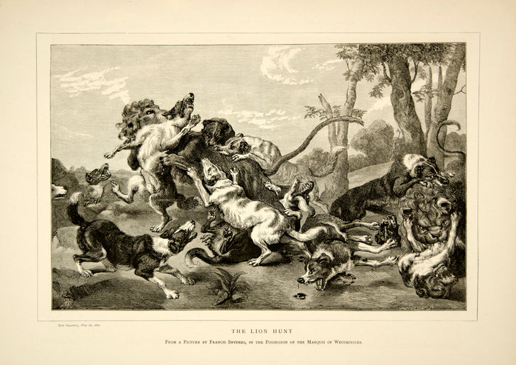 1870 Wood Engraving Francis Snyders Art Lion Hunt Dog Animal Wildlife YTG1