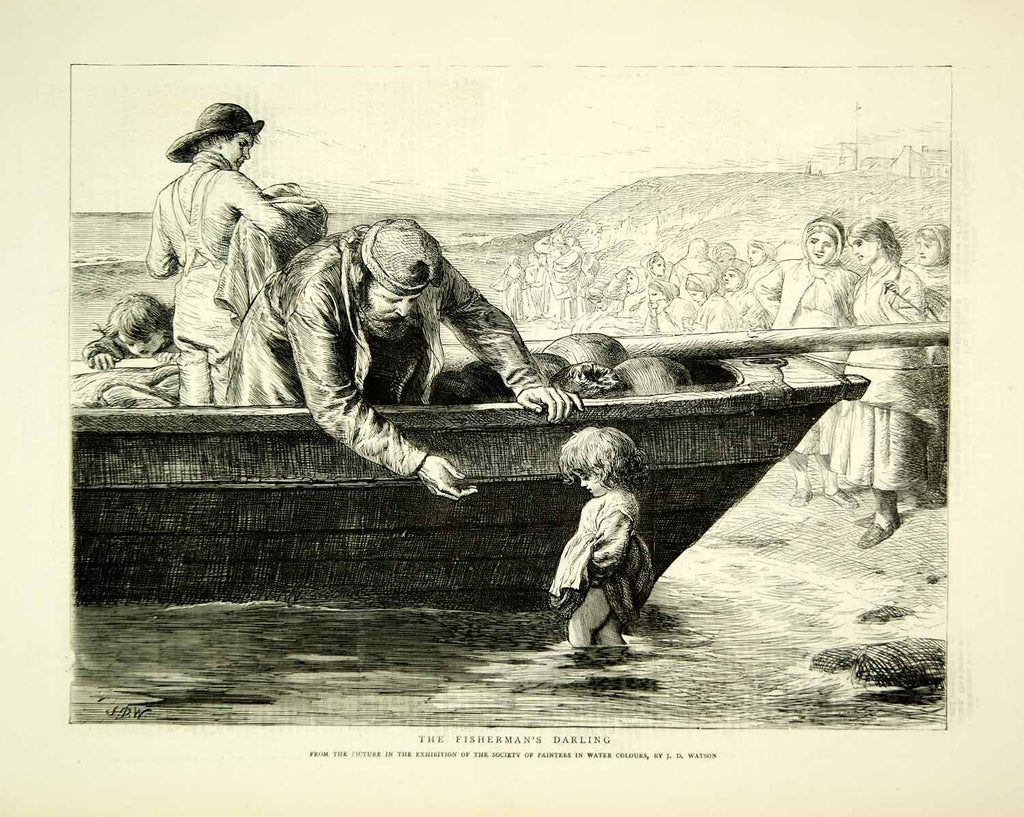 1871 Wood Engraving Art Fisherman Girl Child JD Watson Boat Beach Sea YTG2
