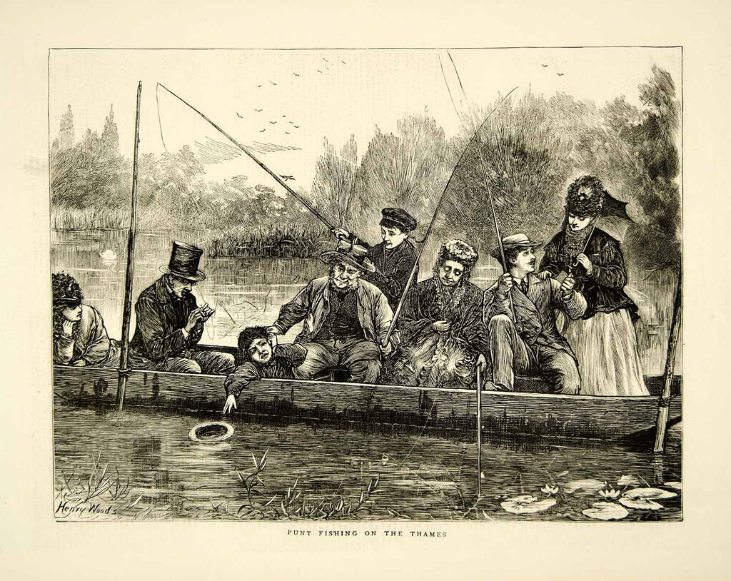 1871 Wood Engraving Art Henry Woods Punt Fishing Thames River England YTG2