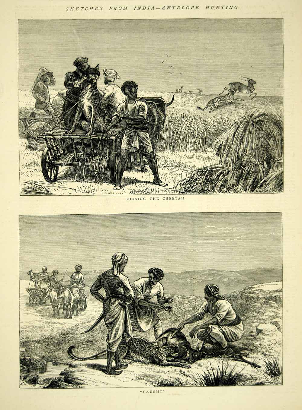 1872 Wood Engraving Art Antelope Cheetah Hunting India Asia Animals YTG4