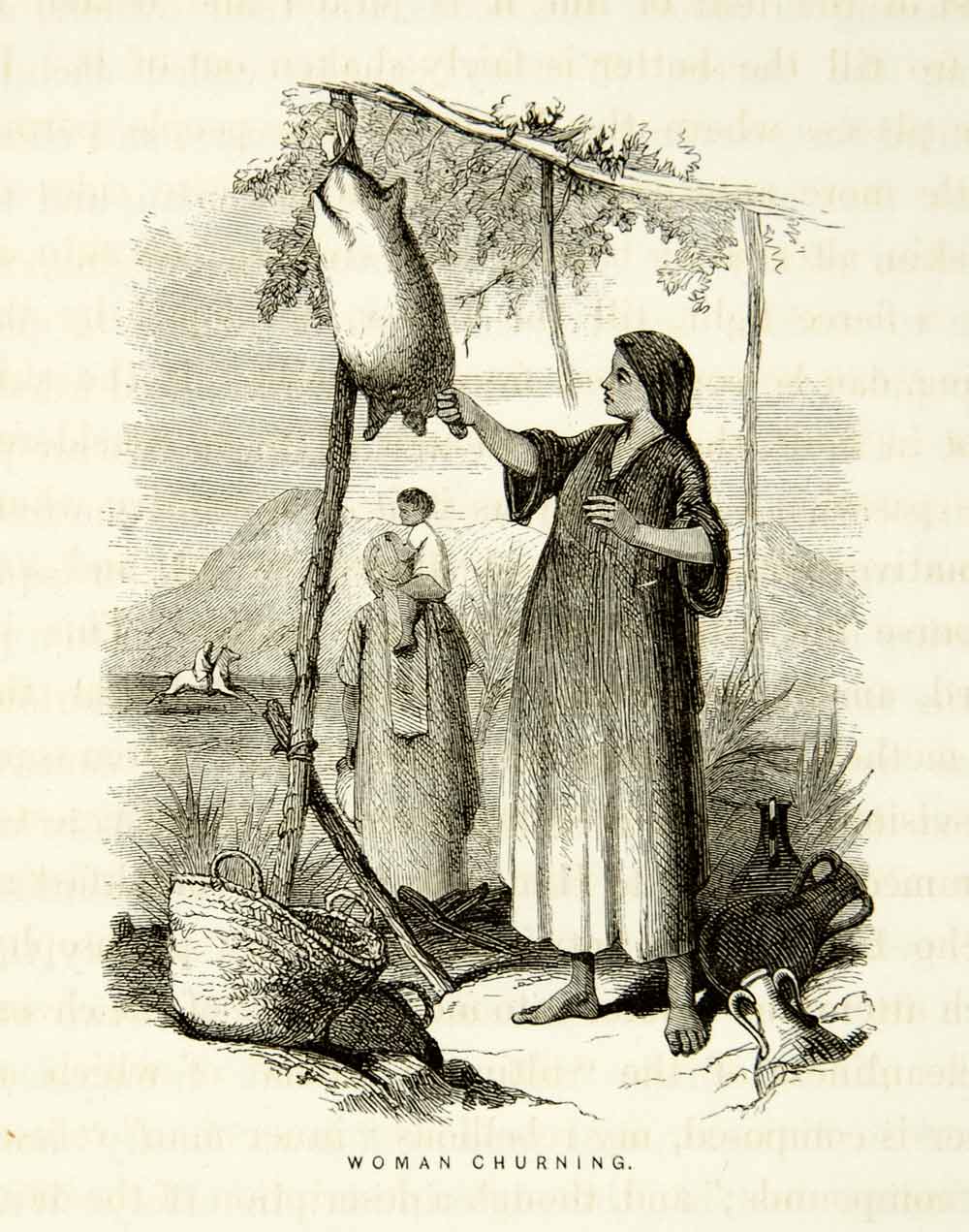1859 Wood Engraving Woman Churning Milk Skin Butter Traditional Ethnic XGAG3