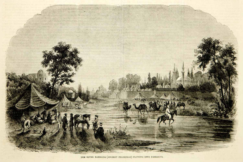 1857 Wood Engraving River Barrada Pharphar Damascus Camels Banks Barada YHW1