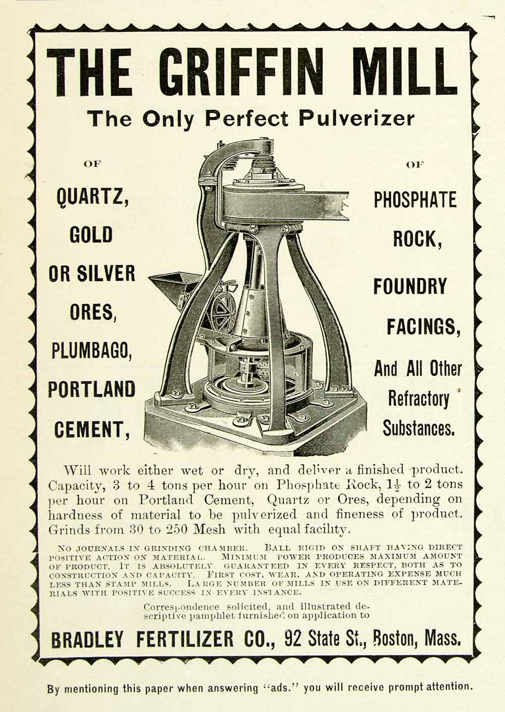 1893 Advert Griffin Mill Pulverizer Bradley Fertilizer 92 State Street WCE1