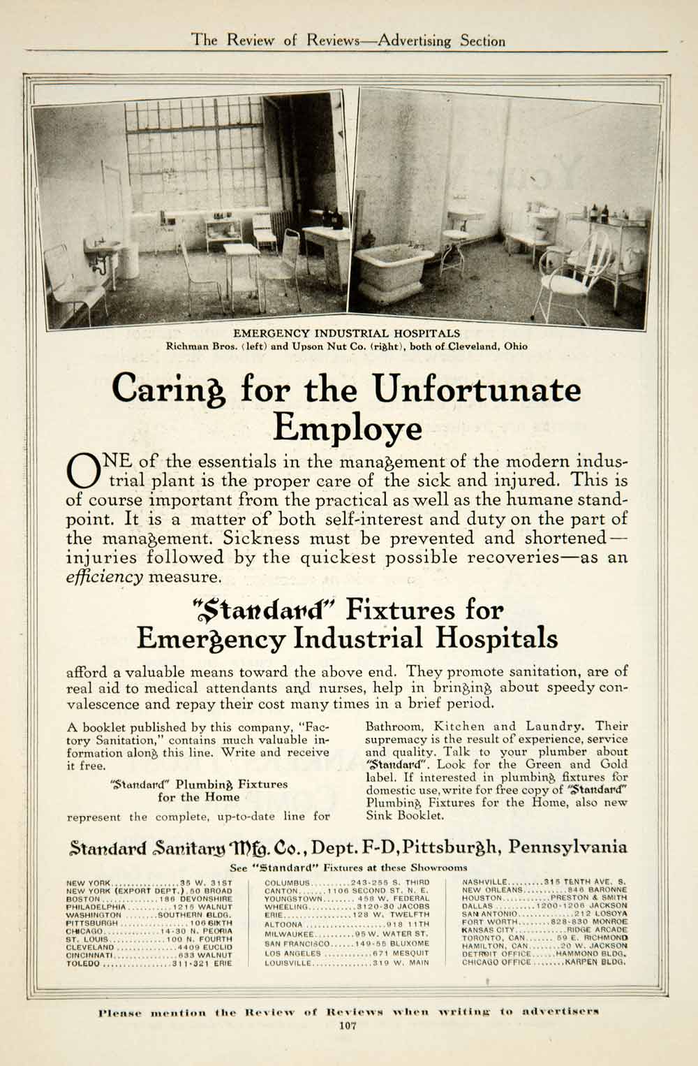 1917 Ad Standard Sanitary Plumbing Fixture Richman Bros Upson Nut Hospital YRR1