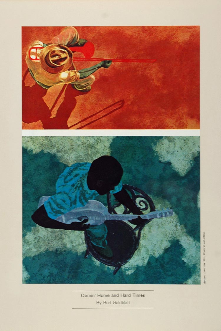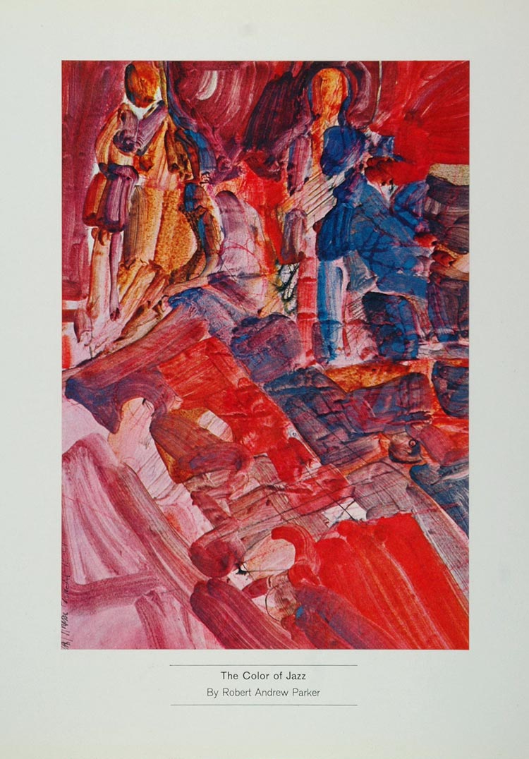 Jazz related art & images via tipped-in color prints and halftone prints from 1962 by Larry Rivers, Ben Shahn, Burt Goldblatt, Charles Stewart, Phillip Evergood, Art Kane & others.