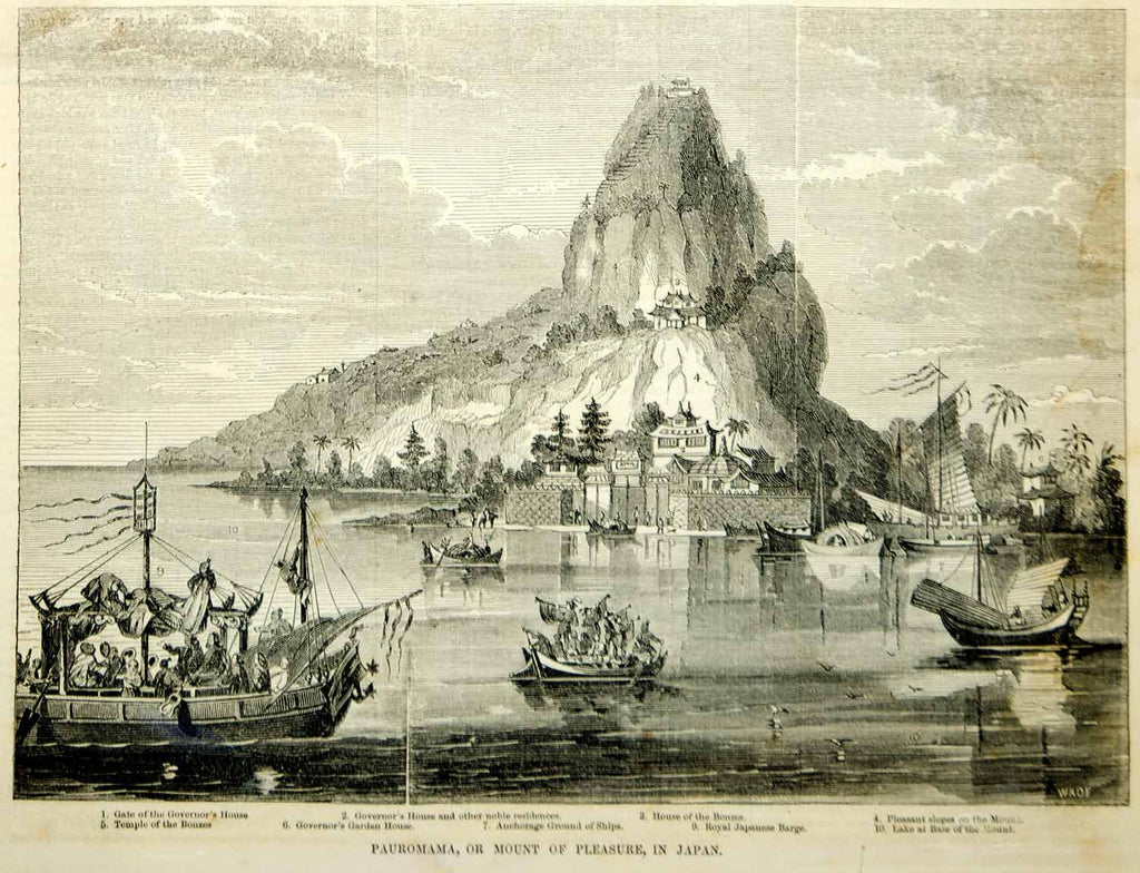 1854 Wood Engraving Mount of Pleasure Japan Mountain Governor's House Antique