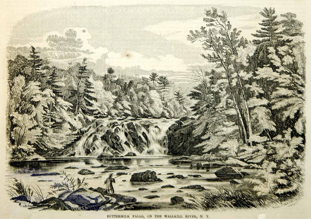 1854 Wood Engraving Buttermilk Falls Wallkill River Landscape Fisherman Antique