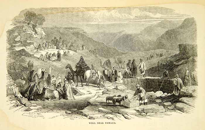 1858 Wood Engraving Art Water Well Emmaus Israel Middle East Arabic Camel XGAD7
