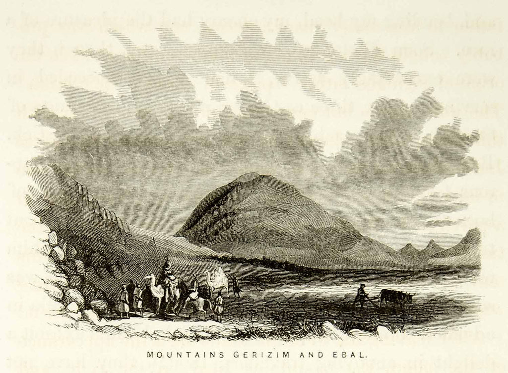 1859 Wood Engraving Mount Gerizim Ebal Nablus Shechem Landscape Camel Plow XGAG3