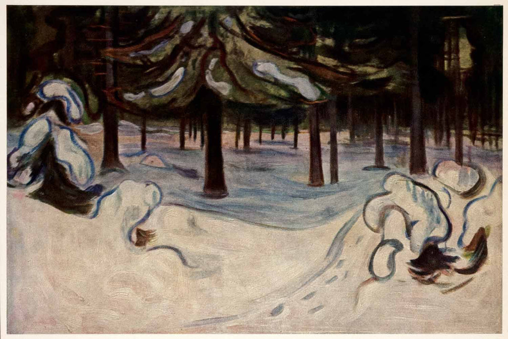 1958 Tipped-In Print Edvard Munch Winter Snow Pine Forest Symbolist Color Art